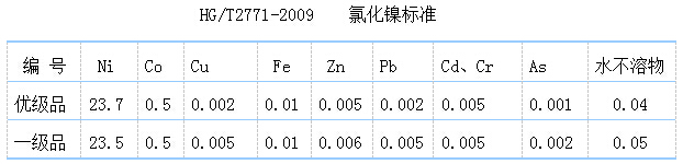 氯化镍产品在制造业中主要用于表面处理电镀产品的添加剂;在化学工业用于制造各种镍化合物,防腐剂和化学反应的催化剂,干电池等;此外氯化镍吸氨性强,可在防毒面具中用作氨吸收剂;氯化镍还用于制造隐型墨水及分析化学中用作分析试剂等