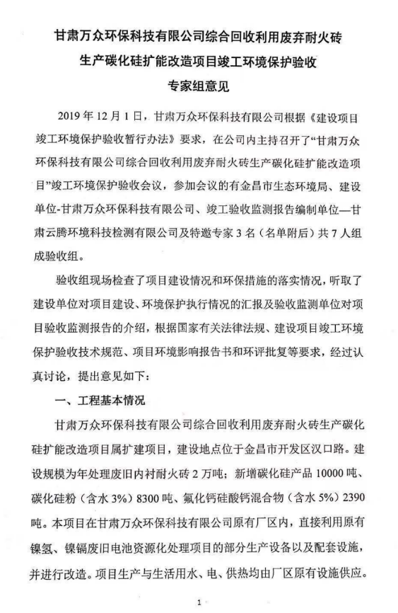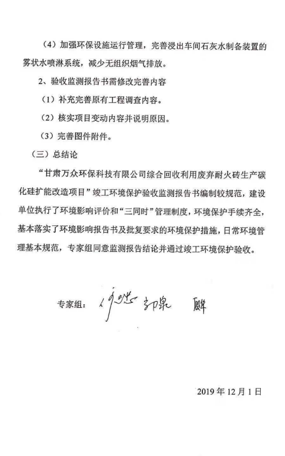 附件:甘肃万众环保科技有限公司综合回收利用废弃耐火砖生产碳化硅扩能改造项目竣工环境保护验收专家组意见