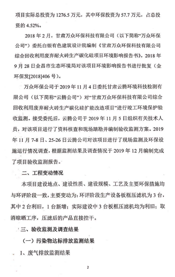 万众环保公司于2019年11月4日委托甘肃云腾环境科技检测有限公司(以下简称“云腾公司”)对“甘肃万众环保科技有限公司综合回收利用废弃耐火砖生产碳化硅扩能改造项目”进行竣工环境保护验收监测。接受委托后,云腾公司于2019年11月5日组织有关技术人员,对该项目进行了资料核查和现场踏勘并编制验收监测方案。2019年11月7-8日、24-25日云腾公司对该项目进行了现场监测及环保设施运行情况调查,根据监测结果及调查情况于2019年12月编制完成了项目验收监测报告。