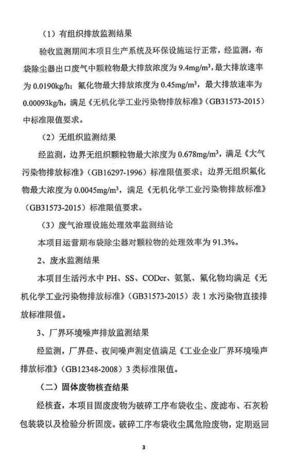 验收监测期间本项目生产系统及环保设施运行正常,经监测,布袋除尘器出口废气中颗粒物最大排放浓度为9.4mg/m3,最大排放速率为0.0190kg/h;氟化物最大排放浓度为0.45mg/m3,最大排放速率为0.00093kg/h,满足《无机化学工业污染物排放标准》(GB31573-2015)中标准限值要求。