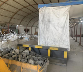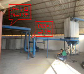 破碎工序采用颚式破碎机和锤式破碎机串联对被腐蚀废耐火砖进行破碎、筛分,项目破碎机均采用下沉式安装在原料库房内离地面两米以下,破碎粉尘由引风机引入布袋除尘器处理后无组织排放到15米高排气筒排放。
