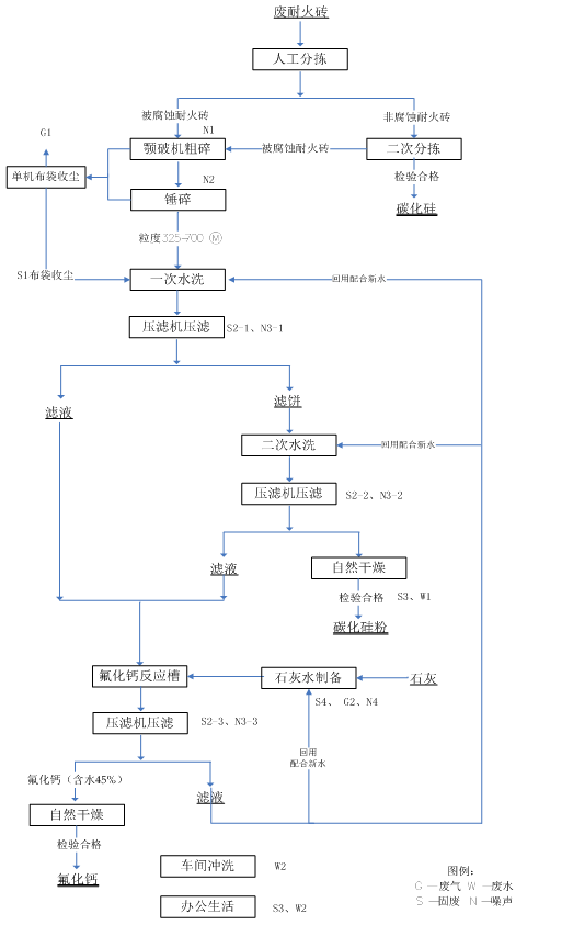 “甘肃万众环保科技有限公司综合回收利用废弃耐火砖生产碳化硅扩能改造项目”属扩建项目,建设地点位于金昌市开发区汉口路。建设规模为年处理废旧内衬耐火砖2万吨;新增碳化硅产品10000吨、碳化硅粉(含水3%)8300吨、氟化钙硅酸钙混合物(含水5%)2390吨。本项目在甘肃万众环保科技有限公司原有厂区内,直接利用原有镍氢、镍镉废旧电池资源化处理项目的部分生产设备以及配套设施,并进行改造。项目生产与生活用水、电、供热均由厂区原有设施供应。项目实际总投资为1276.5万元,其中环保投资为57.7万元,占总投资的4.52%。