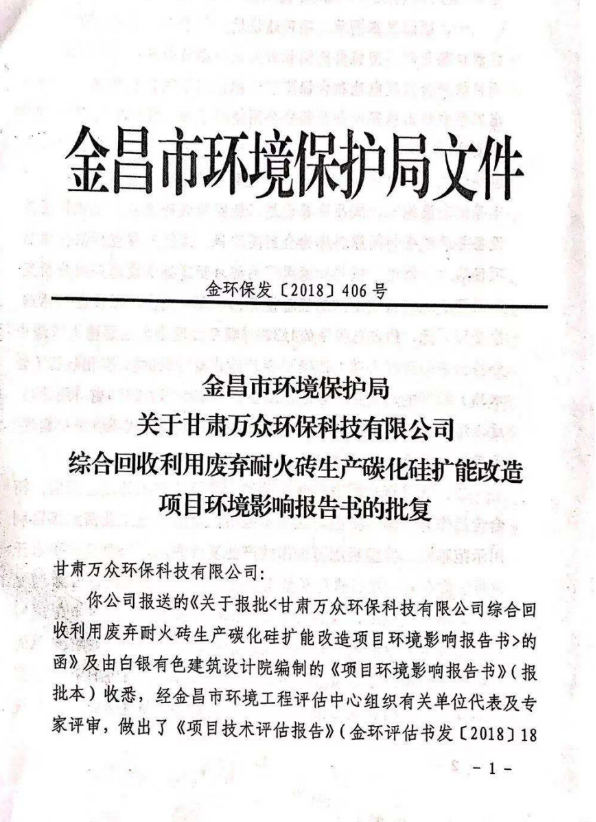 2018年2月,甘肃万众环保科技有限公司(以下简称“万众环保公司”)委托白银有色建筑设计院编制《甘肃万众环保科技有限公司综合回收利用废弃耐火砖生产碳化硅项目环境影响报告书》,2018年9月28日金昌市生态环境局对该项目环境影响报告书进行批复(金环保发[2018]406号)。