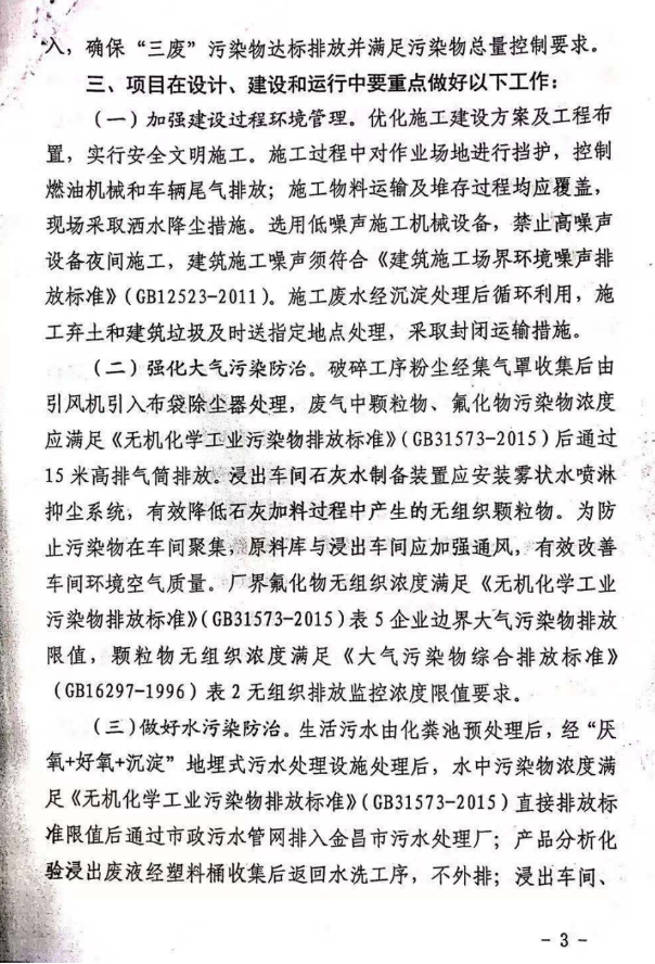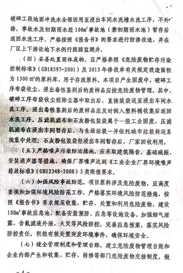 | 加强风险事故防范。项目原料涉及危险废物,应高度重视和加强环境风险防范工作,严格落实环境风险防范措施,按照《报告书》要求规范收集、贮存、处置和利用危险废物,建设100m3事故应急池,配备安装预防、应急等设施设备,加强烟气泄露、含氟滤液外泄、火灾等风险防控,完善应急预案,落实风险防控责任,积极有效处置突发环境事件,确保环境安全。 |