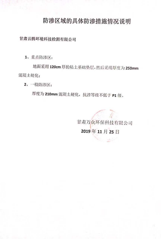 已制定各项环境保护制度。 防渗措施: 重点防渗区:地面采用120cm厚的粘土基础垫层+250mm混凝土硬化; 一般防渗区:厚度为210mm混凝土硬化,抗渗等级不低于P1级。 |